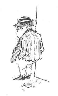 The illustration I’ve copied shows Abu Ali and Silver Bud on the left, while his rival suitors, TinTac Ping Foo and Rubdub Ben Thud look on from the right. Noel Langley, who wrote the novel, was a South African writer, who wrote the original screenplay for the smash hit film “The Wizard of Oz”, but this book, I think, is his most inspired creation, and it’s perfectly portrayed in Ardizzone’s unique and distinctive style. It's a style which is light years removed from my own, with relatively few bold lines, and a range of shading and just suggested outliines which give his figures a shadowy, indistinct quality, almost like sfumato in its effect. If you look at this particular illustration I've tried to copy, the two foregrounded figures to the left are the two villains, Tintac Ping Foo and Rubdub Ben Thud, and I think that you can still clearly start to get an idea of these villains particular qualities.
